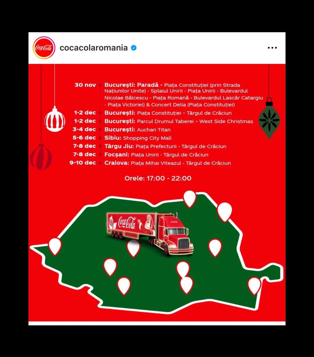 Caravana Coca-Cola va ajunge zilele viitoare la Târgu Jiu. Această va staționa în Piața Prefecturii din centrul municipiului, în zilele de 7 și 8 decembrie, între orele 17:00-22:00.