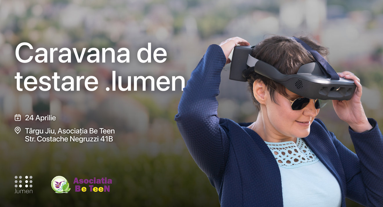 Caravana de testare a ochelarilor pentru nevăzători dezvoltați de .lumen ajunge astăzi, la sediul Asociației Be Teen, situat pe strada Costache Negruzzi nr. 41B, Târgu Jiu. Evenimentul aduce în comunitatea locală o tehnologie asistivă de ultimă generație, creată în România, la Cluj, menită să îmbunătățească mobilitatea și independența persoanelor cu deficiențe de vedere.