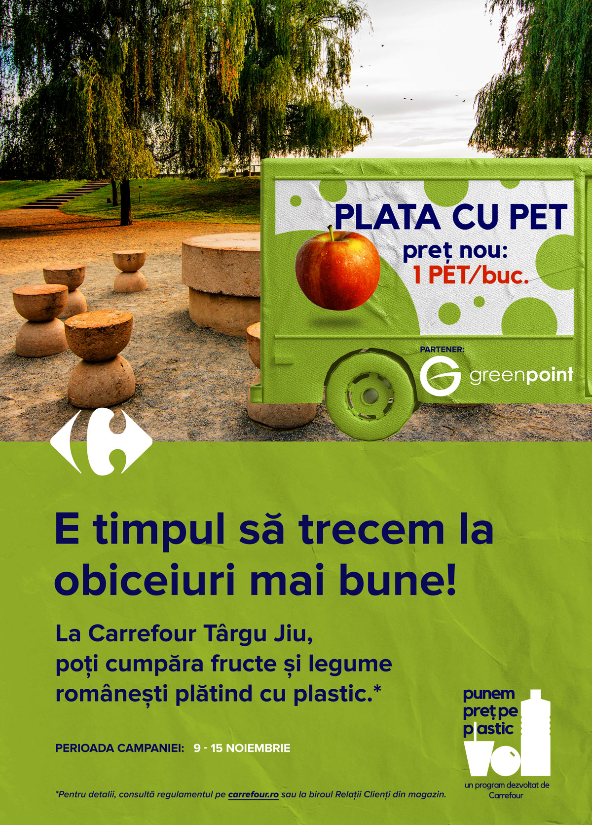 Carrefour România, cu sprijinul GreenPoint Management reia Caravana Plata cu PET toamna aceasta și încurajează toți locuitorii din Târgu Jiu să treacă la obiceiuri mai bune și să colecteze selectiv deșeurile de plastic de tip PET. Timp de 7 zile, în perioada 9 – 15 noiembrie, locuitorii din Târgu Jiu vor putea aduce ambalaje de tip PET la Caravana amplasată în fața hipermarketului și vor primi în schimb fructe și legume de la producători locali.