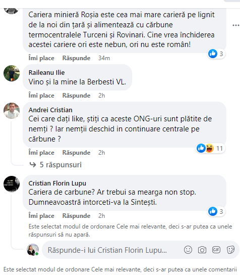 ”Invocați o primă decizie a unei instanțe judecătorești din București pentru a închide/bloca cea mai mare carieră minieră de extracție a lignitului, din România, fără să conștientizați cât rău social și economic faceți întregii zone a Olteniei, dar și României! Uitați-vă chiar la această oră când dumneavoastră faceți această mizerie, cât de mult contează CĂRBUNELE pentru Sistemul Energetic Național! Încă o dată vă spun că sunteți mai degrabă un trădător de țară și de neam, și nici decum un politician român care ar trebui mai întâi de toate să facă o politică pentru interesele națiunii, ci nu pentru interesele străinilor!”