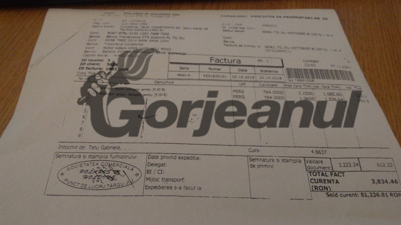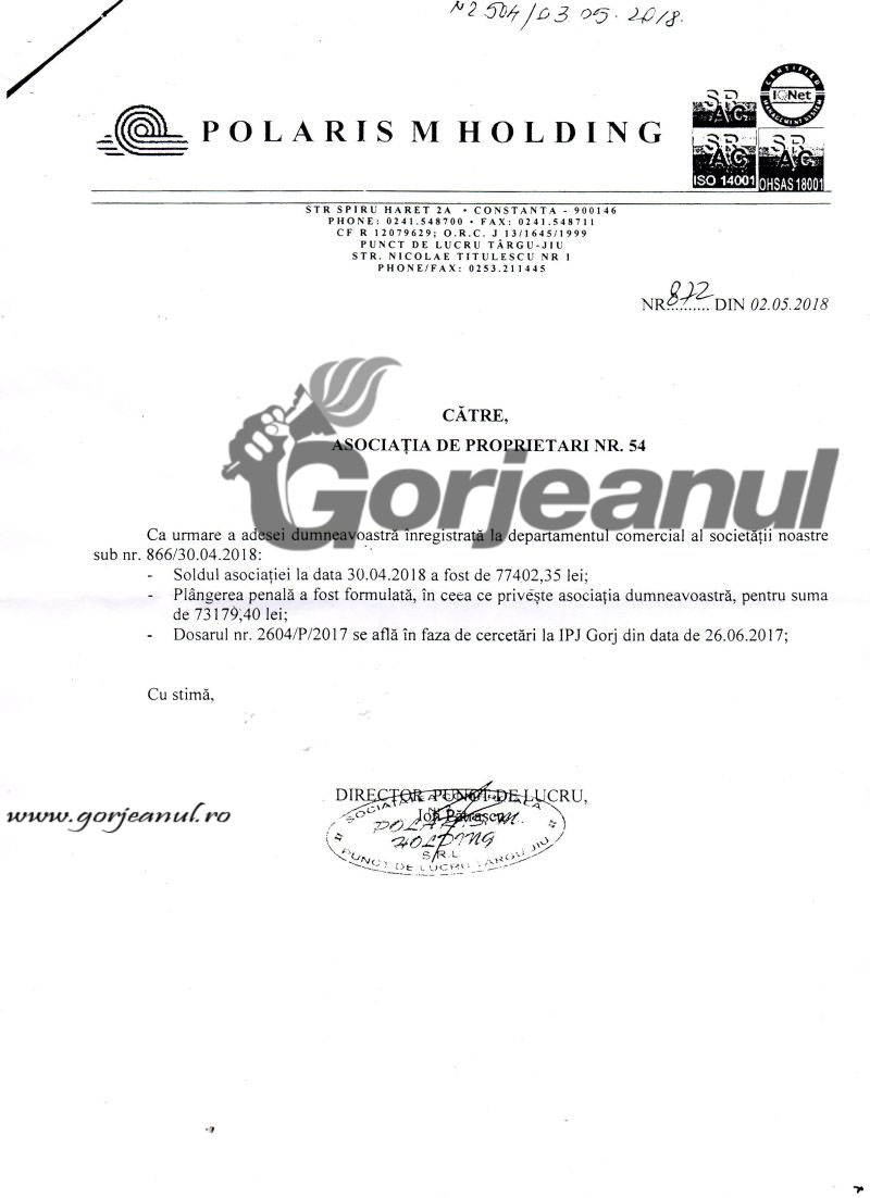 Polaris până la soluționare, vă mulțumim pentru sprijin și sperăm în urgentarea rezolvării aspectelor menționate”, transmite președintele asociației de proprietari. Din acest motiv evident, administratorul asociației respective refuză să semneze pentru primirea facturii, care include și restanța, adică banii sustrași de casiera respectivă, dar cu toate acestea SC Polaris M. Holding trimite prin poștă factura completată cu restanța inexistentă ca să oblige salariata să își asume primirea acesteia. Problema a fost comunicată, din nou, primarului municipiului Târgu-Jiu.