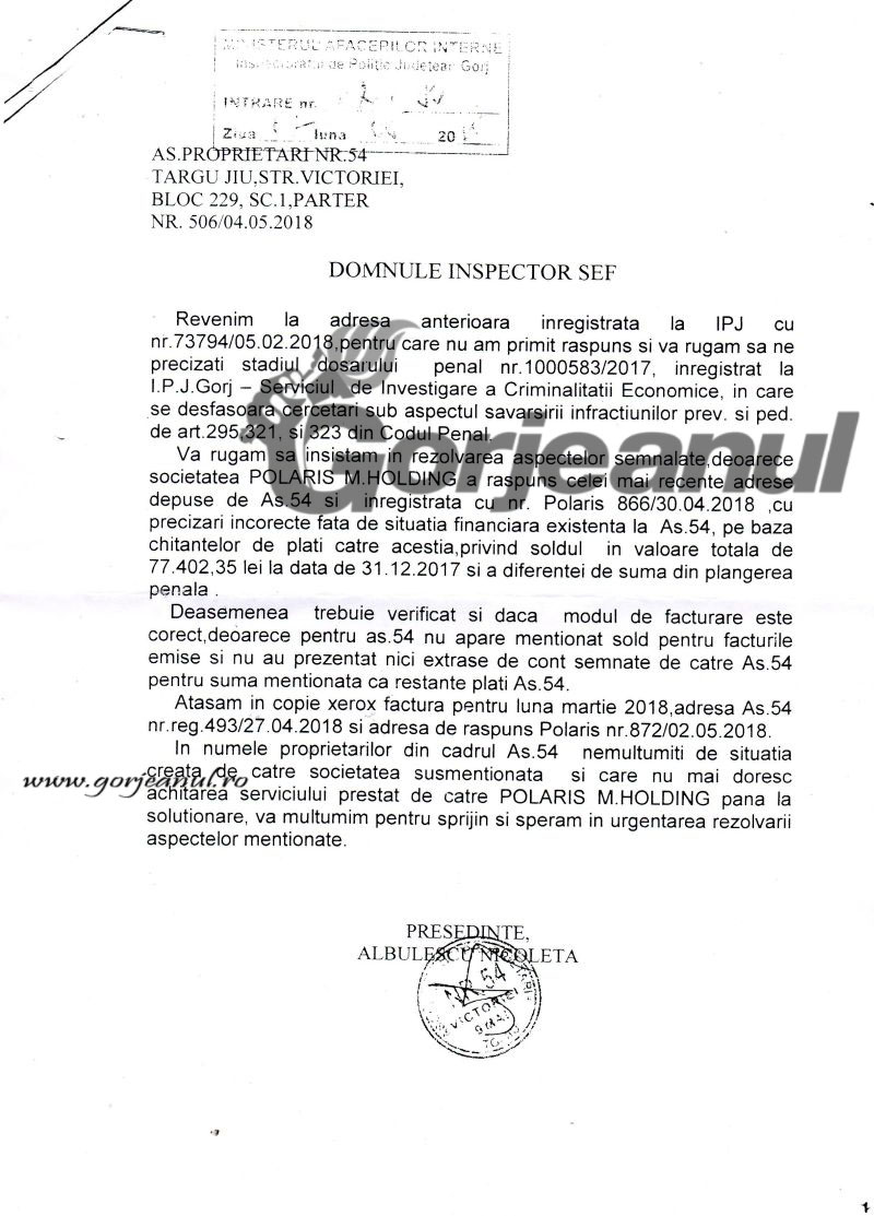 Asociația de Proprietari nr.54 din Târgu-Jiu, care primește încă facturi de la Polaris în care figurează și debitul de peste 77.000 de lei, bani plătiți de proprietari pentru gunoi, dar sustrași de către casiera aflată momentan în străinătate. Polaris are grijă în mai 2018 să informeze asociația că datorează banii sustrași, dar și că societatea a formulat o plângere penală împotriva propriei salariate, anexată aceluiași dosar 2604/P/2017.