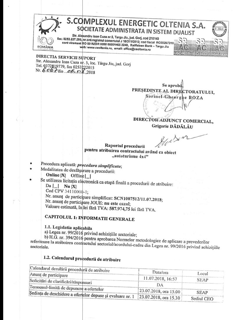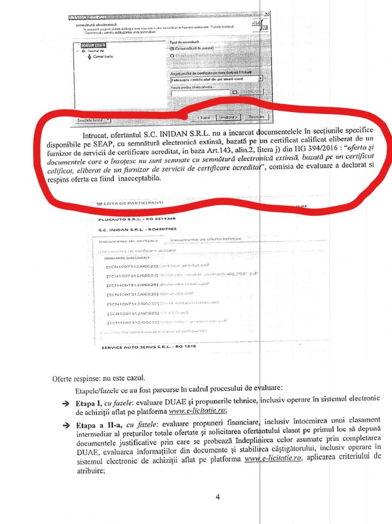 deoarece firma nu a încărcat documentele în SEAP cu semnătură electronică extinsă. Oferta de preț a firmei lui Gugea nu apare în raportul de procedură nr. 6064 din 6 august 2018 pentru atribuirea contractului având ca obiect “autoturisme 4×4”, și asta, pare-se, din vina dealerului.