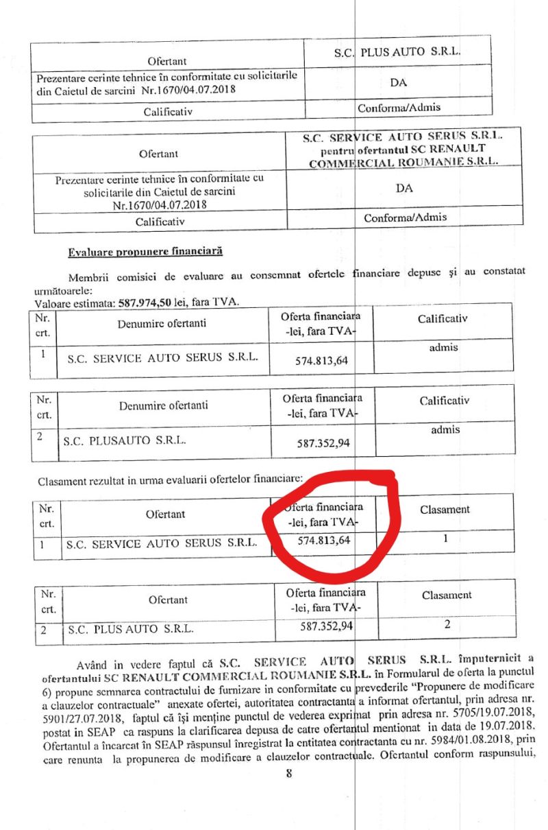 Firma SERUS aparține fraților Adrian și Matache Rustea, dealer Dacia, Renault și Nissan în Capitală. La licitație mai participă și SC PLUS AUTO SRL din Craiova care vine cu un preț de 587.352,94 de lei fără TVA, dar și INIDAN SRL a cărei ofertă este declarată “inacceptabilă”,
