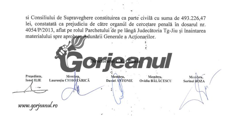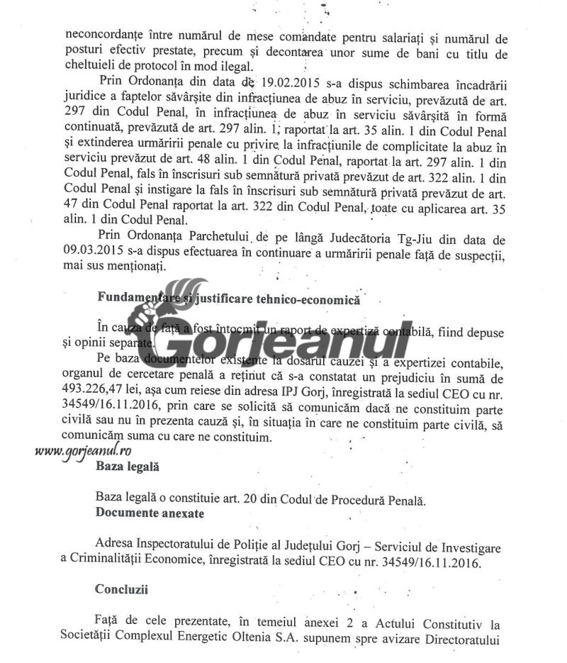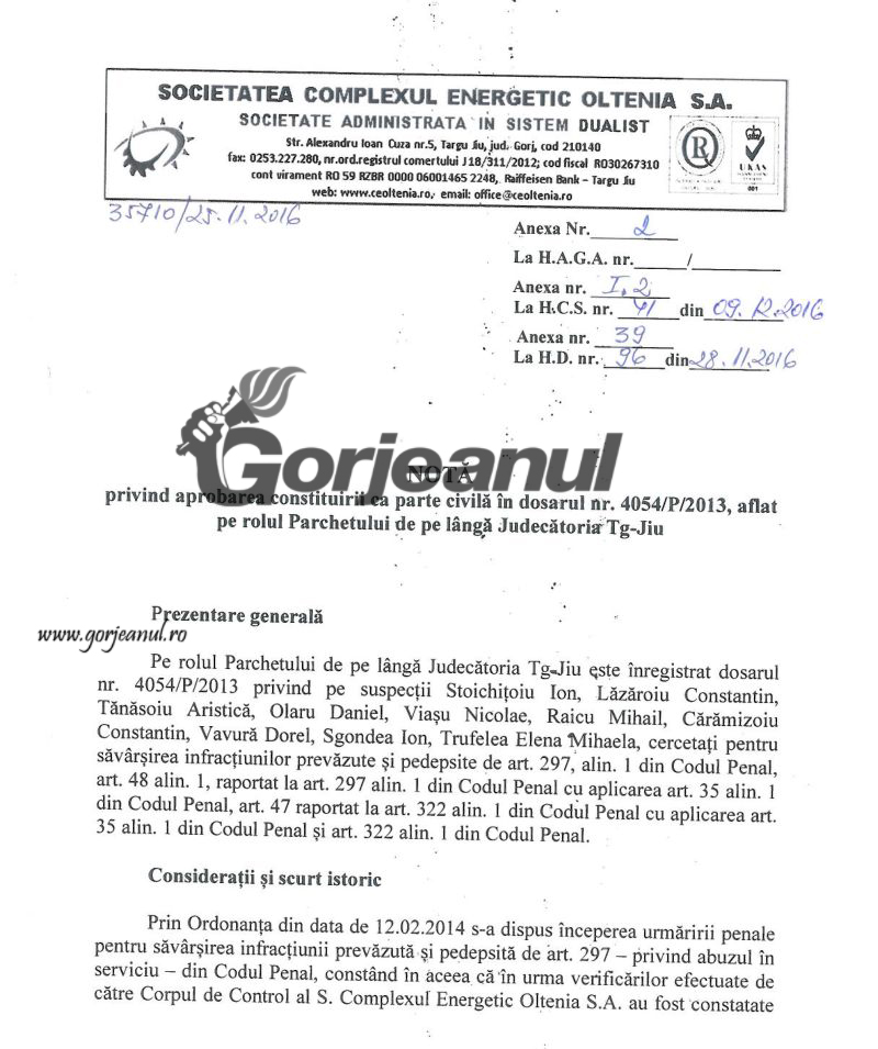 Adunarea Generală Extraordinară a Acționarilor Complexului Energetic Oltenia va pune în discuție, în ședința din 16 ianuarie, aprobarea constituirii companiei ca parte civilă, cu suma de aproape 500.000 de lei, constatată ca prejudiciu de cercetare penală, în dosarul nr. 4054/P/2013, aflat în lucru la Parchetul de pe lângă Judecătoria Târgu-Jiu. Este vorba despre dosarul denumit “Masa caldă II”, în care sunt vizați zece salariați ai companiei.