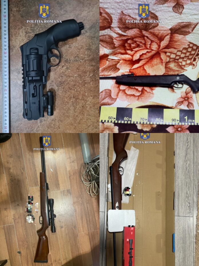 În urma activităților desfășurate, polițiștii au descoperit și ridicat de la domiciliile celor percheziționați 3 arme neletale, cu țeava lungă, de tir sportiv cu aer comprimat, calibru 4,5, o armă neletală scurtă, tip revolver, calibru 50, 1.238 de diaboluri calibru 4,5, alte 200 de diaboluri calibru 5,5 și 2 sisteme de ochire (lunete).