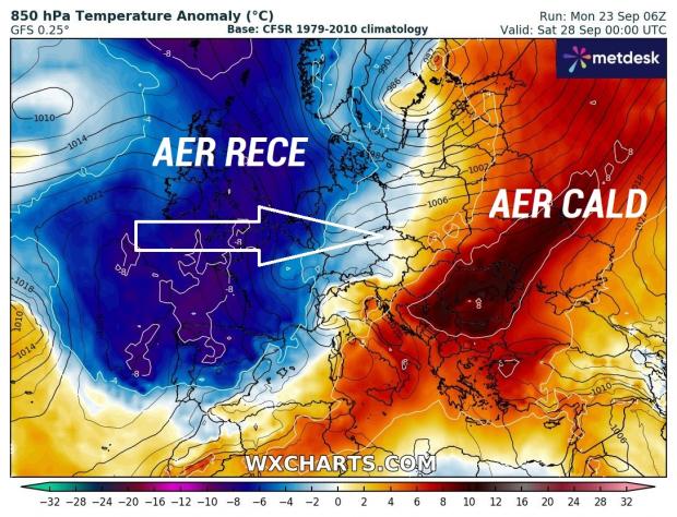 „Ne așteptăm ca, mai ales începând de duminică, vremea din punct de vedere termic să se răcească semnificativ în aproape toată țara. Dacă până sâmbătă vorbim de temperaturi mai ridicate pentru o ultimă decadă a unei luni septembrie în țara noastră, pentru că ecartul termic se situează între 20-25 până la 34 de grade Celsius pentru ziua de vineri, cea mai caldă zi din această săptămână, cele 33-34°C fiind de așteptat în sudul extrem, în sudul Câmpiei Române și în Lunca Dunării, respectiv de duminică, valorile de temperaturi nu vor mai înregistra valori decât până la 22°cel mult. Iată o diferență la nivel național de la 34 până la cel mult 22 în partea de sud-sud-est a țării, în timp ce în regiunile intracarpatice chiar valori mai coborâte, de până la 15-16° așadar valori cu mai puțin de 10-15° față de ce vom înregistra în aceste zile.