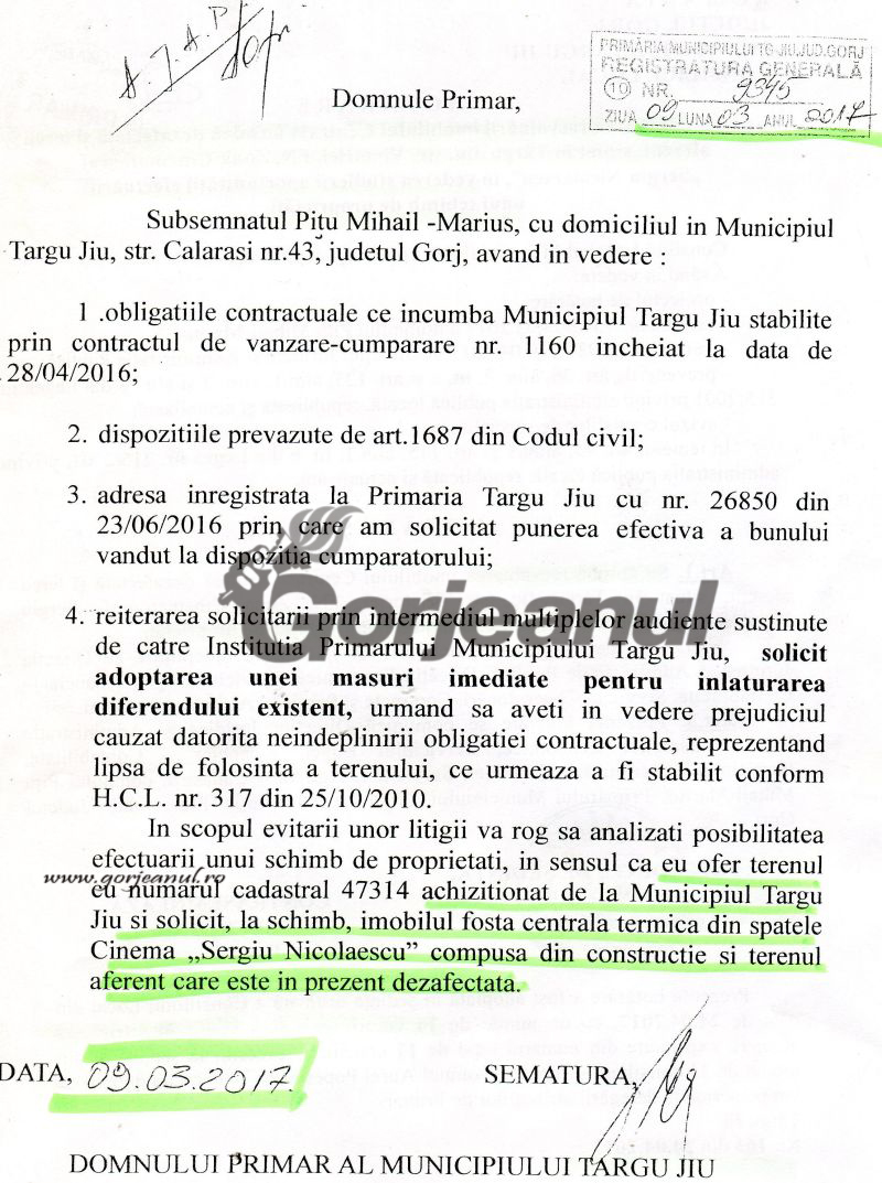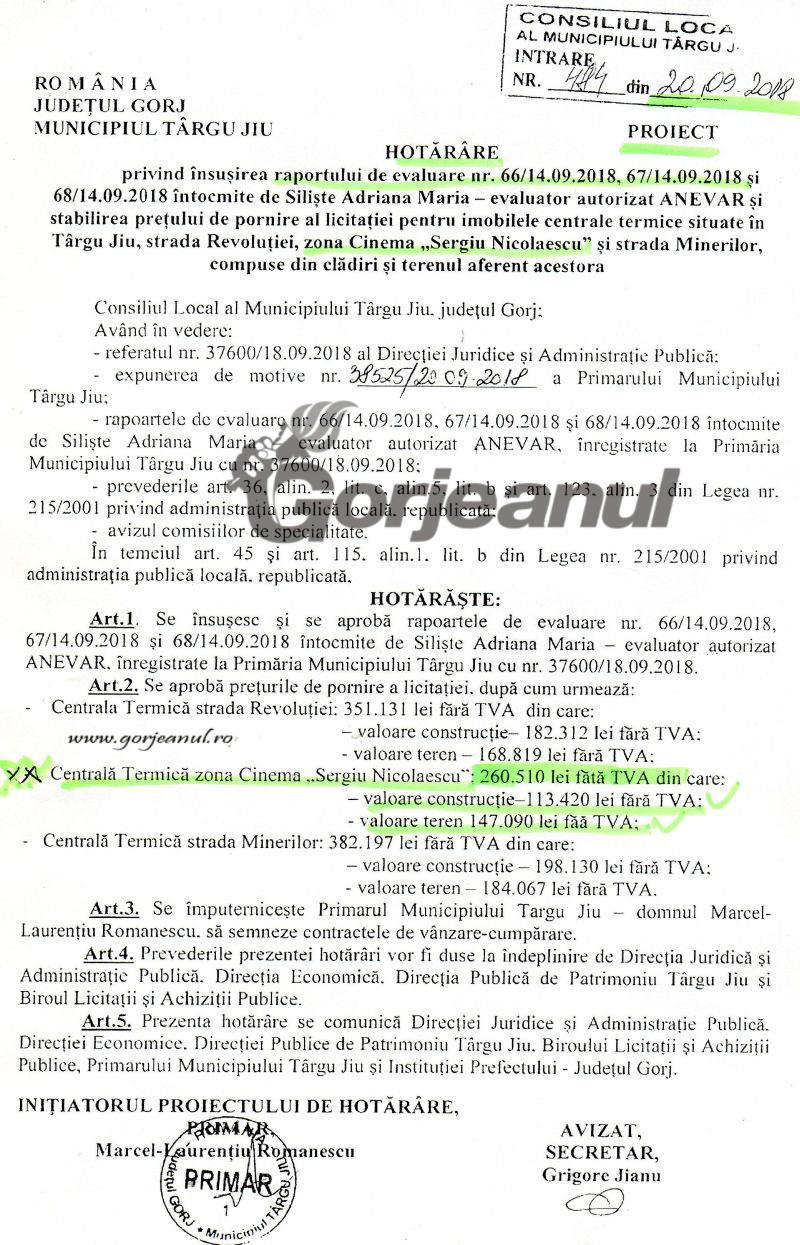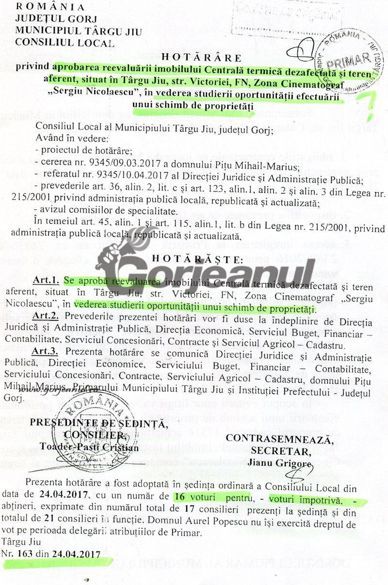 s-a mai realizat, după ce Gorjeanul a relatat că imobilul se vroia schimbat cu un teren pe care Pițu îl achiziționase de la Primăria Târgu-Jiu, cu un an în urmă. Pentru centrala de pe Minerilor nu se aflau anexate documente privind evaluarea făcută, la hotărârea ce urma a fi, luni, supusă votului aleșilor locali, în timp ce pentru centrala de pe Victoriei, erau probleme încă nerezolvate cu vechiul proprietar și de acolo evaluarea cu numărul trei lipsea.