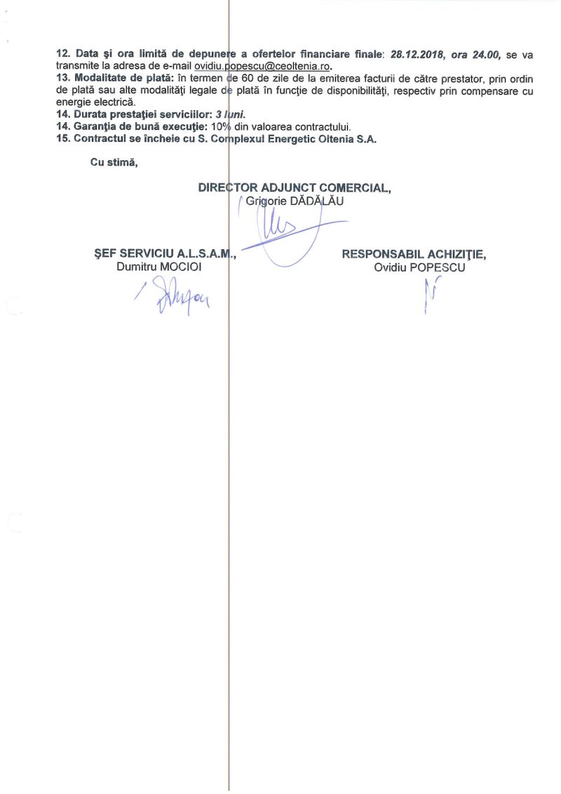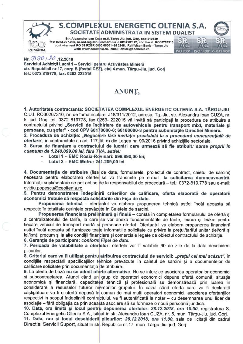 CEO a selectat prin negociere directă, transportatorii care vor asigura în primele trei luni ale acestui an, transportul intern al salariaților de la carierele aparținând EMC Motru și EMC Roșia-Rovinari. Pentru primul EMC, compania a asigurat 998.890 lei iar pentru EMC Roșia-Rovinari încă 241.209 lei. Ofertații erau obligați să depună la CEO o ofertă tehnică și una financiară, ultima conținând și tarifele de lei/oră și lei/km pentru fiecare vehicol ofertat. Criteriul atribuirii contractului era prețul cel mai scăzut fiind permisă asocierea firmelor și subcontractarea. Ofertele s-au depus până pe data de 28 decembrie la registratura CEO și s-au deschis în acceași zi, conform anunțului CEO.