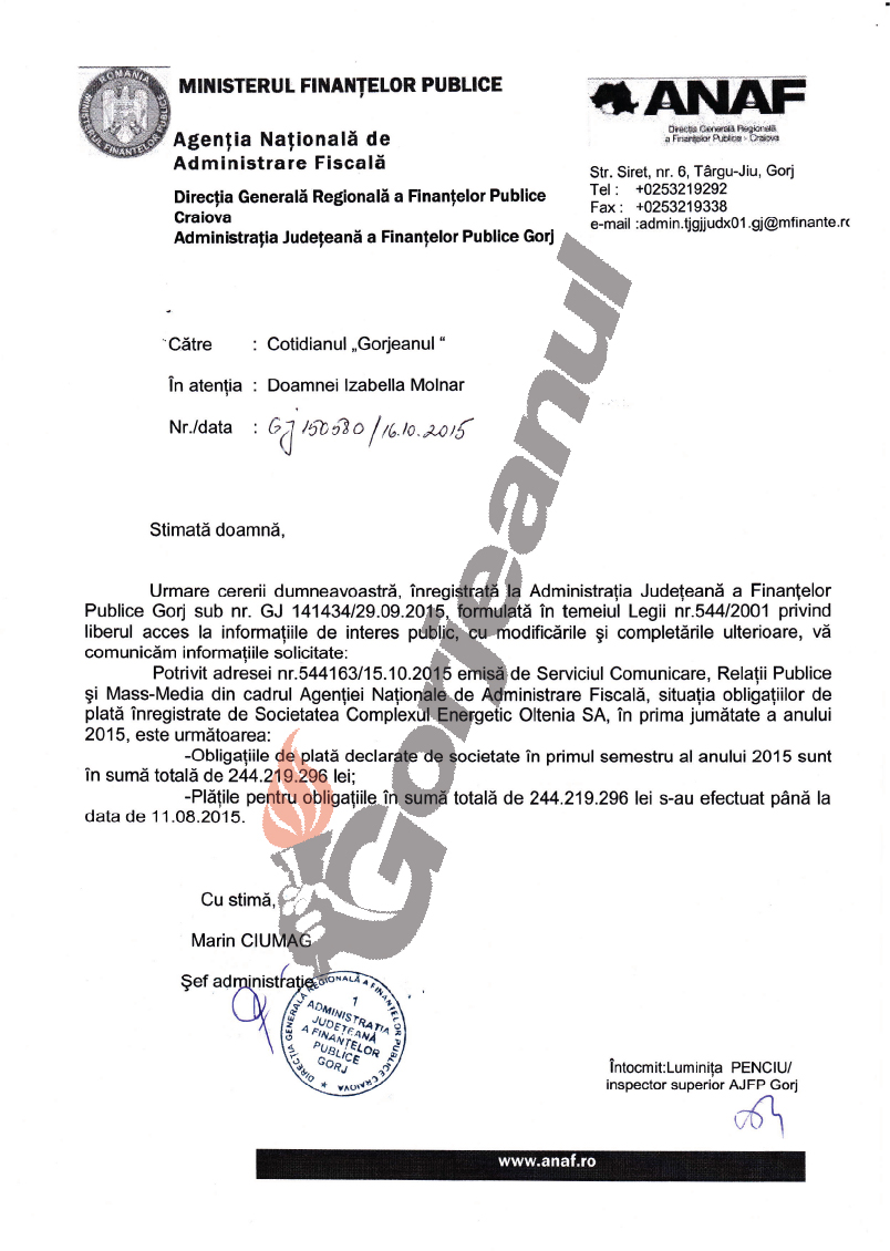 ANAF începuse executarea silită a Complexului Energetic Oltenia în luna iulie a lui 2015, moment în care se întocmise Raportul Consiliului de Supraveghere Asupra Activităţii de Administrare a companiei pe prima jumătate a acestui an, pentru o datorie a societăţii la bugetul statului de peste 24 de miliarde de lei vechi. În mai puţin de o lună şi jumătate de la începerea procedurii de executare silită, CEO reuşeşte însă să se scape de debitul astfel acumulat, achitând, mai exact, 244.219.296 de lei până pe data de 11 august 2015, ieşind astfel de sub procedura de executare impusă de ANAF. Trei săptămâni mai târziu, după ce nu comunicase nimic despre datoria mare spre ANAF, CEO se lăuda pe site-ul propriu, ca răspuns la un material de presă publicat de Gorjeanul, că la data respectivă, adică la începutul lunii septembrie societatea nu avea datorii la bugetul statului. Acum spune acelaşi lucru, negând chiar că a fost vreodată în procedura de începere a executării silite, deşi ar mai fi acumulat, din august până în prezent, la acelaşi capitol, un debit la ANAF de peste 10,7 milioane de lei.