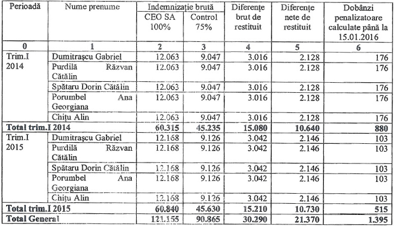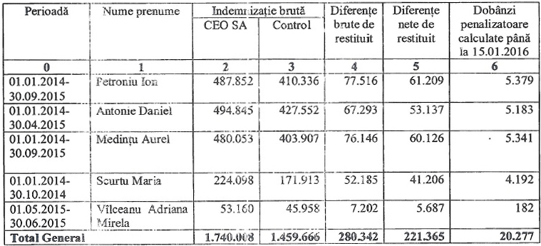 Membrii Directoratului au încasat însă, ilegal, sume mult mai mari, se arată în documentul anexă al convocatorului AGOA. Astfel, Ion Petroniu directorul Departamentului Strategii Dezvoltare, pentru perioada ianuarie 2014-septembrie 2015, este obligat să dea înapoi nu mai puțin de 61.209 lei, în timp ce Aurel Medințu, directorul Diviziei Energetice, pentru perioada ianuarie 2014-septembrie 2015, va trebui să restituie 60.126 de lei. O sumă apropiată, respectiv 53.137 de lei trebuie să-i dea înapoi și Daniel Antonie, directorul Diviziei Miniere, pentru ianuarie 2014-aprilie 2015, în timp ce 41.206 lei îi va restitui și Maria Scurtu, directorul Diviziei Financiare, asta pentru perioada ianuarie 2014-octombrie 2014. Și Adriana Vîlceanu, directorul Diviziei Financiare, va da înapoi 5.687 de lei pentru banii încasați necuvenit pentrui mai-iunie 2015.