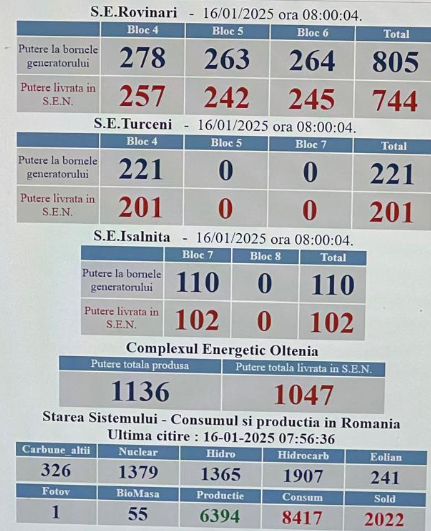 CEO, cu 5 grupuri ”în priză”! Complexul Energetic Oltenia salvează din nou Sistemul Energetic Național. Trei grupuri sunt pornite la Termocentrala Rovinari, unul la Termocentrala Turceni, iar Termocentrala Ișalnița a pornit singurul grup pe care-l mai are. În total, Complexul Energetic Oltenia funcționează cu cinci grupuri care salvează astăzi sistemul energetic național, la ora 8.00 livrând peste 1.000 de MW, într-o perioadă de ger, când România nu mai poate importa fiindcă fiecare stat european are nevoie de energie în această perioadă friguroasă. Numai de la Rovinari sunt peste 700 MW livrați în sistemul energetic național. Două dintre aceste grupuri sunt pe lista neagră a Ministerului Energiei, pentru a fi închise!