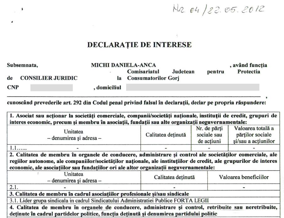 Mai trec, în schimb, cinci luni, sub titulatura de comisar-şef adjunct al CJPC Gorj, până când Michi realizează că s-a aflat în incompatibilitate. Pe semne îi convenea acesteia dublul statut, mai ales că la sindicat, aşa cum arată documentul anexat de la “Forţa Legii”, a fost aleasă pe 4 ani, din 3 noiembrie 2011, ca lider grupă sindicală şi în conducerea organului suprem al organizaţiei sindicale.