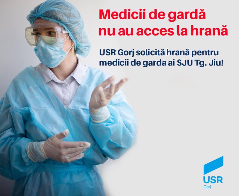 Radu Miruță, președintele USR Gorj, solicită ca medicilor de gardă din cadrul Spitalului Județean de Urgență din Târgu-Jiu să li se asigure câte o porție de hrană, atunci când se aduce masa pacienților internați.