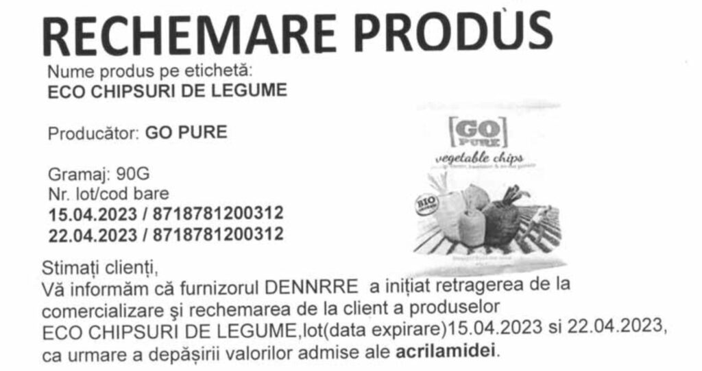 ”Furnizorul DENNRRE a iniţiat retragerea de la comercializare şi rechemarea de la client a produselor Eco chipsuri de legume lot (dată de expirare) 15 aprilie 2023 şi 22 aprilie 2023, ca urmare a depăşirii valorilor admise ale acrilamidei”, este anunţul postat pe site-ul ANSVSA.
