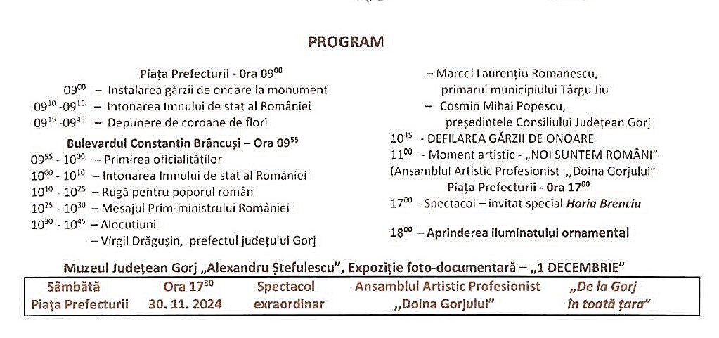 De asemenea, de 1 Decembrie are loc, la ora 10:00, parada militară pe Bulevardul Constantin Brâncuși, zona din fața Primăriei Târgu Jiu.