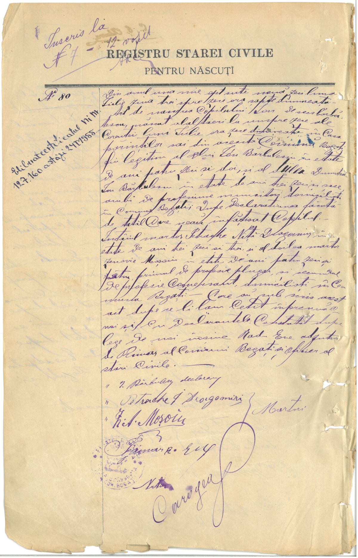 Astfel, așa cum se poate vedea, la actul nr. 80 din Registrul Stării Civile pentru născuți din anul 1890, luna iulie, ziua treisprezece, la ora șapte dimineața, apare înregistrată nașterea copilului ION, de sex bărbătescu, născut alaltăieri la unsprezece ale curentei luni Iulie, ora zece dimineața, în casa părinților săi din această comună Bogați, fiu legitim al Dlui Ion Bărbulescu, în etate de ani 42 și al Dumitra Ion Bărbulescu, în etate de ani 36, ambii de profesiune muncitori domiciliați în comuna Bogați.