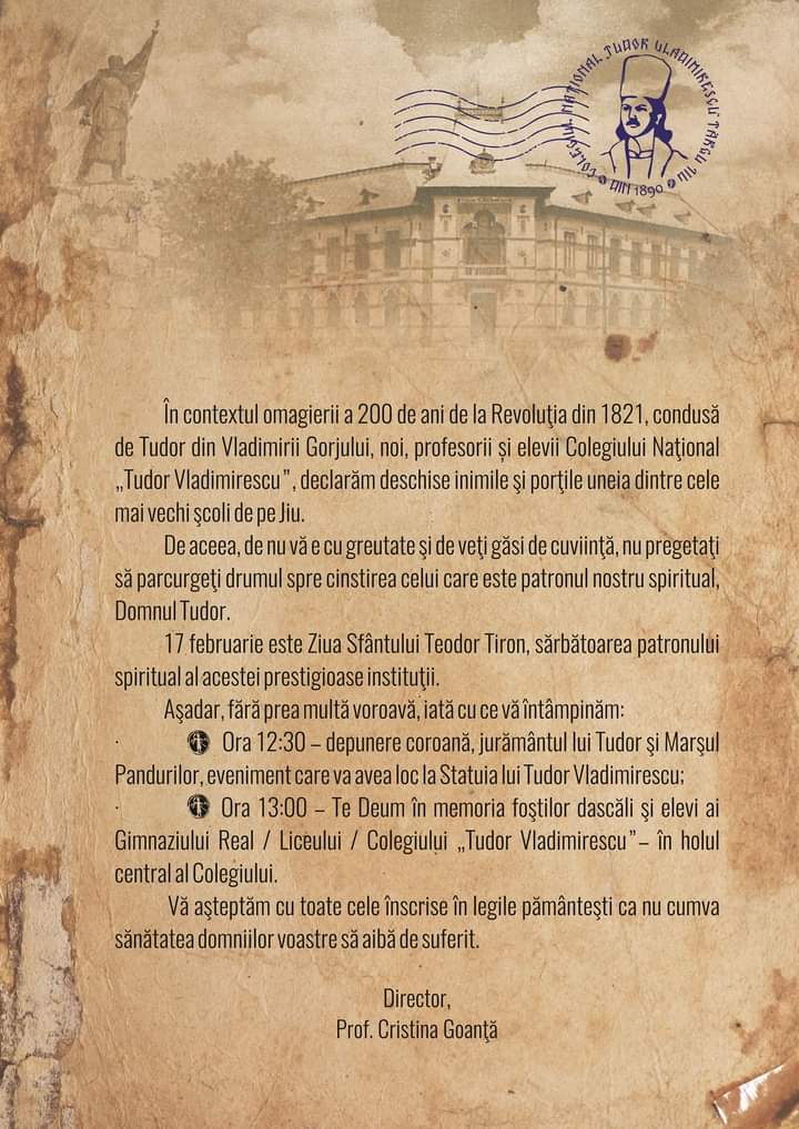 Colegiul National „Tudor Vladimirescu” Târgu-Jiu își va sărbători mâine patronul spiritual, Sfântul Teodor Tiron. Pentru a marca această ocazie, vor fi organizate două evenimente: