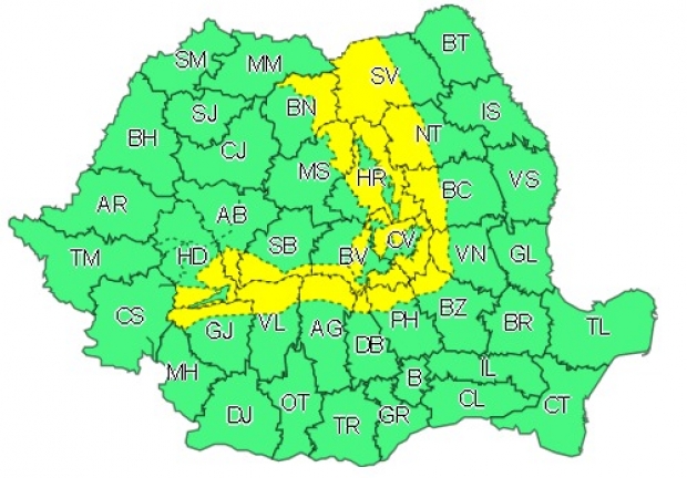 Judeţele vizate de atenţionarea Cod galben sunt: Alba, Argeş, Bacău, Bistriţa-Năsăud, Braşov, Buzău, Covasna, Dâmboviţa, Gorj, Hunedoara, Harghita, Mureş, Neamţ, Prahova, Sibiu, Suceava, Vâlcea şi Vrancea.