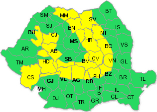Avertizarea cod galben a fost emisă pentru judeţele Caraş-Severin, Hunedoara, Gorj, Vâlcea, Argeş, Dâmboviţa, Prahova, Buzău, Vrancea, Bacău, Neamţ, Suceava, Maramureş, Bistriţa-Năsăud, Mureş, Harghita, Covasna, Braşov, Sibiu, Alba, Cluj şi Bihor.