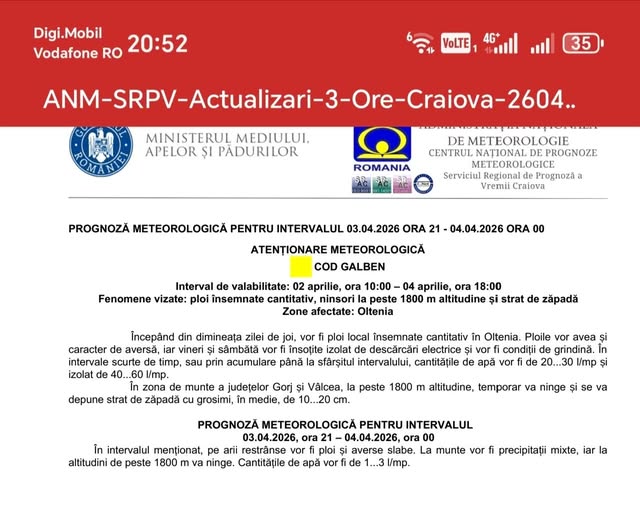 În intervalul 02 aprilie, ora 10:00 – 04 aprilie, ora 18:00, este în vigoare o atenționare meteorologică de ploi însemnate cantitativ, pentru zona Olteniei.