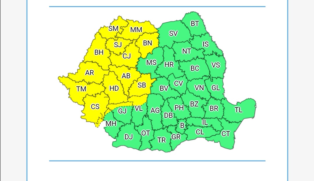 Notă: Manifestări de instabilitate atmosferică se vor semnala pe arii restrânse și în restul țării, mai ales în zonele de deal și munte.