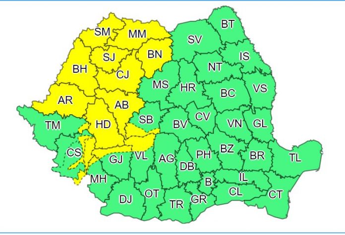 Judeţele aflate sub Cod galben sunt Satu Mare, Maramureş, Bihor, Sălaj, Bistriţa-Năsăud, Arad, Cluj, Alba şi Hunedoara, în totalitate, şi Sibiu, Vâlcea, Gorj, Mehedinţi, Caraş-Severin şi Timiş, parţial.