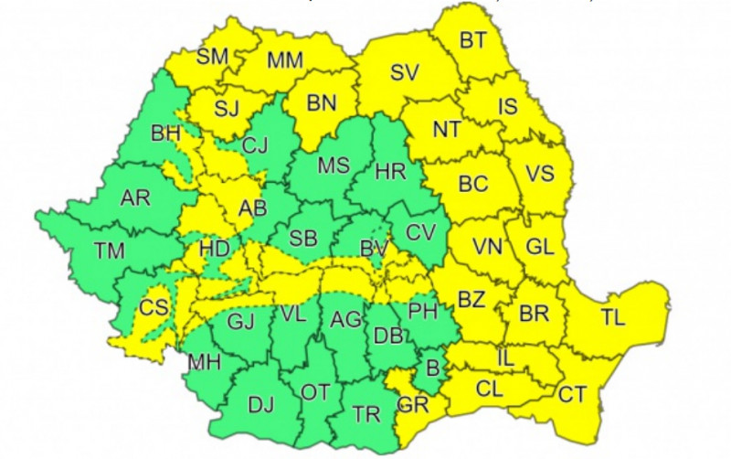 Zonele vizate de codul galben de instabilitate atmosferică temporar accentuată sunt cele din Maramureș, Moldova, Dobrogea, local în nordul Transilvaniei, în Muntenia și la munte, unde vor fi perioade cu averse torențiale.