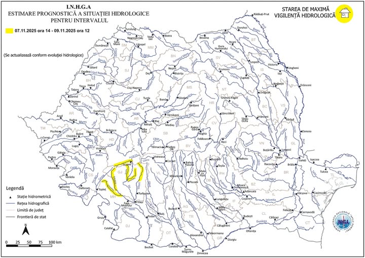 Cod Galben pe râuri din județele Hunedoara, Gorj și Mehedinți. Având în vedere situaţia hidrometeorologică actuală şi prognoza meteorologică pentru următoarele 48 de ore, se instituie Codul Galben de inundații, valabil în intervalul 7 noiembrie, ora 14:00 – 9 noiembrie, ora 12:00, anunță hidrologii.