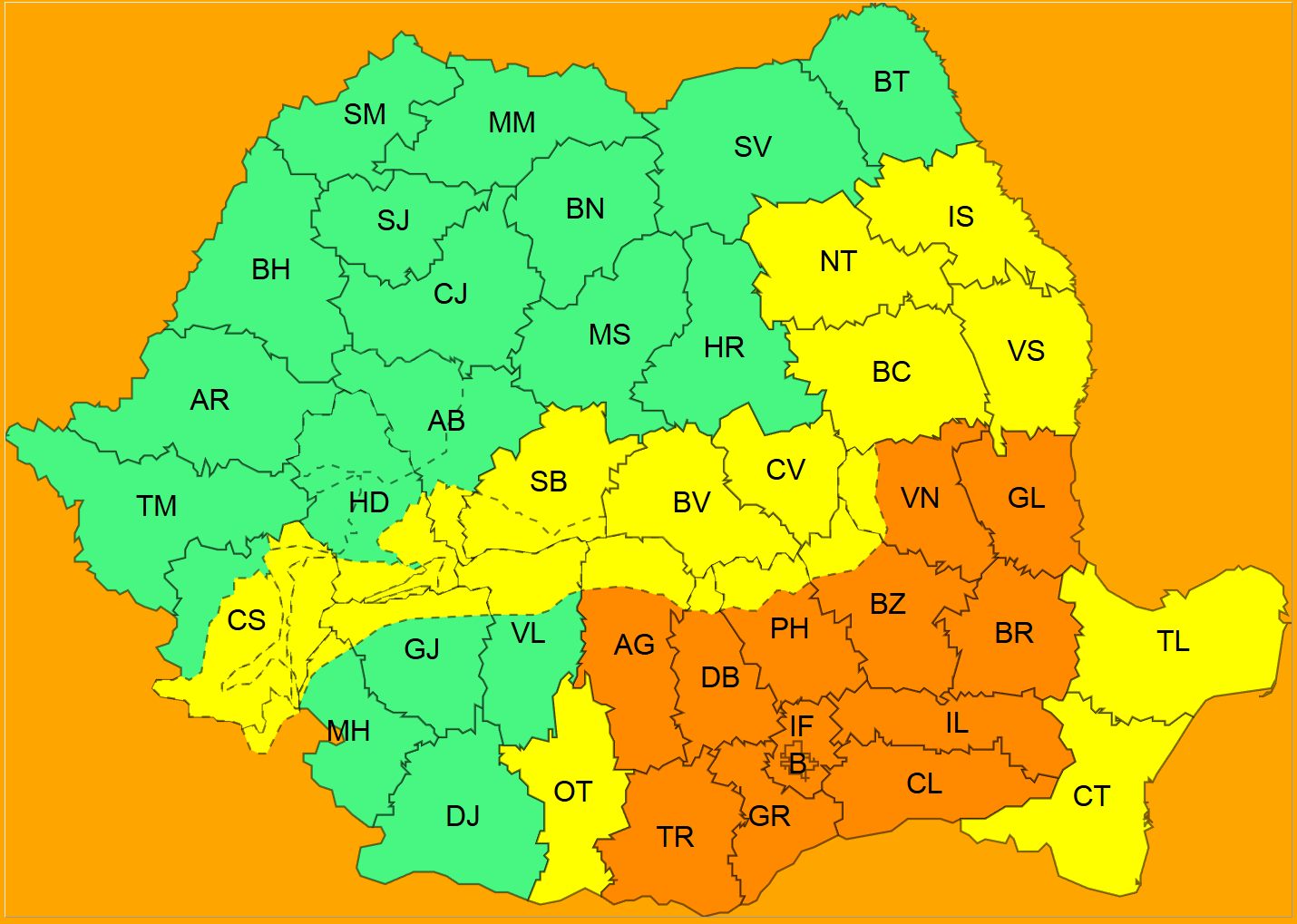 Cea mai severă avertizare este un Cod portocaliu, valabil din 17 februarie, ora 20:00, până pe 18 februarie, ora 12:00. În acest interval, în Muntenia și în sudul Moldovei sunt prognozate ninsori abundente, care vor duce la depunerea unui strat consistent de zăpadă, cu grosimi cuprinse între 20 și 50 de centimetri (echivalentul a 20–50 l/mp). Vântul va sufla cu putere, atingând la rafală viteze de 60–85 km/h, cele mai afectate urmând să fie județele Vrancea, Galați, Buzău, Brăila, Ialomița și Călărași. Meteorologii avertizează că va fi viscol puternic, zăpada va fi troienită, iar vizibilitatea poate scădea sub 50 de metri.
