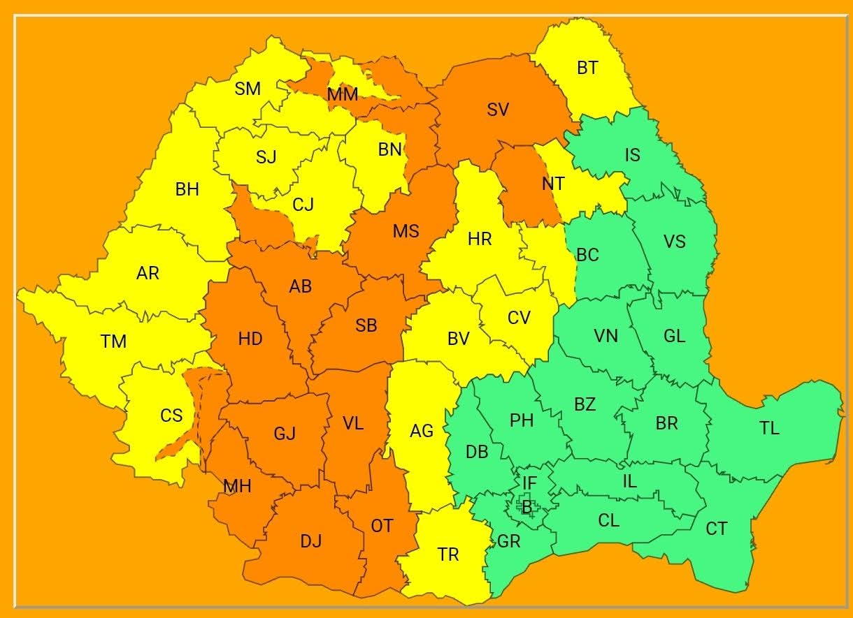 Județul Gorj este vizat de codul portocaliu care intră în vigoare azi, la ora 15:00 și expiră la noapte, la ora 23:00.