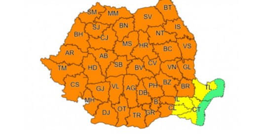 Meteorologii au emis noi alerte de vreme severă, între care un Cod portocaliu de furtună în majoritatea județelor țării. Avertizarea intră în vigoare de joi ora 12.00 și este valabilă până vineri ora 6.00 și anunță vijelii puternice, grindină de medii și mari dimensiuni, dar averse torențiale în toată țara, cu excepția județelor Tulcea și Constanța.