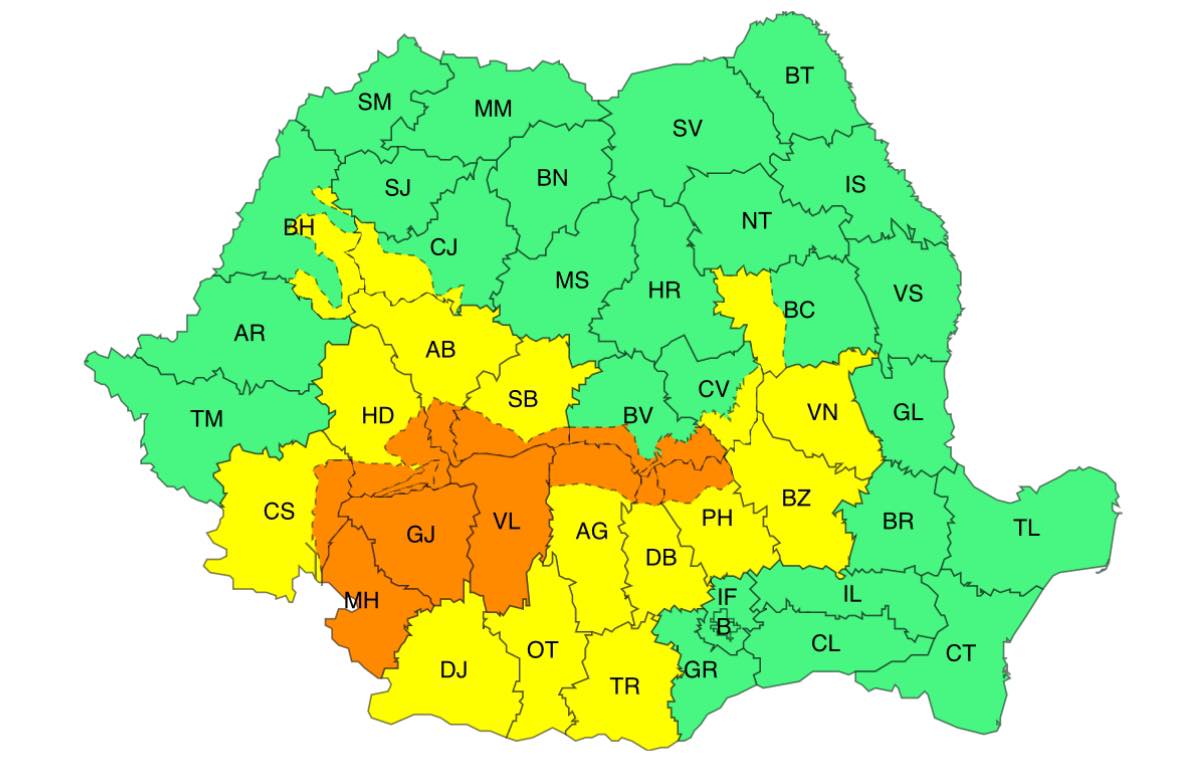 Cod portocaliu în Gorj! Și un avertisment hidrologic. A fost convocată ședința extraordinară a Comitetului ministerial pentru situații de urgență al Ministerul Mediului – România, ca urmare a avertizărilor meteorologice și hidrologice transmise în această dimineață de Administratia Nationala de Meteorologie RA și de Institutul Național de Hidrologie și Gospodărire a Apelor, comunică Apele Române Jiu.