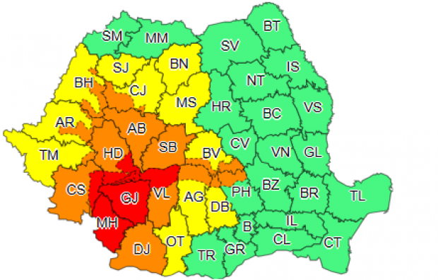 Administrația Națională de Meteorologie a emis o avertizare cod roșu de ploi torențiale abundente în județele Caraș-Severin, Hunedoara, Vâlcea, Gorj, Mehedinți. Alerta de vreme severă va intra în vigoare diseară, de la ora 20.00, și este valabilă până marți dimineață, la ora 8.00.