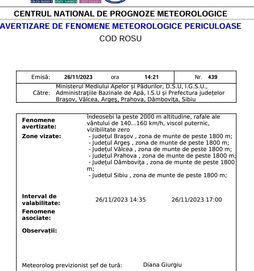 Având în vedere fenomenul meteo prognozat de ANM, viscol cu viteză de 160 km/h, există posibilitatea de restricționare a circulației rutiere pentru siguranța participanților la trafic”.