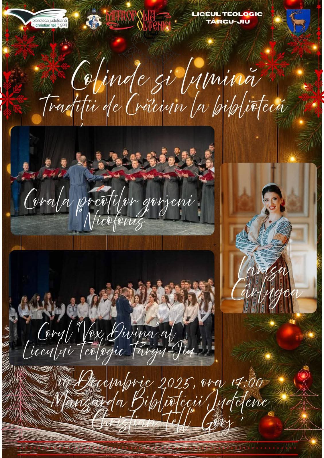Biblioteca Județeană „Christian Tell” Gorj, în parteneriat cu Liceul Teologic din Târgu Jiu, organizează pe 10 decembrie 2025, începând cu ora 17:00, evenimentul „Colinde și lumină. Tradiții de Crăciun la bibliotecă”, în MansArta Bibliotecii Județene.