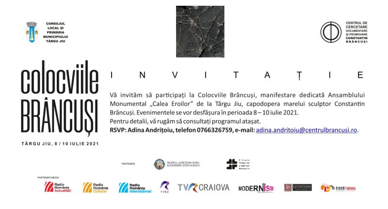 Centrul de Cercetare, Documentare și Promovare „Constantin Brâncuși”, Consiliul Local și Primăria Municipiului Târgu Jiu organizează, în zilele de 8 și 9 iulie 2021, COLOCVIILE BRÂNCUȘI, manifestare care continuă seria programelor dedicate Ansamblului Monumental „Calea Eroilor”. Joi, 8 iulie, de la ora 16, la Casa Grădinarului din Parcul Central, va fi vernisată expoziția de grup „Identități vizuale”, al cărei curator este prof. Vasile Fuiorea, președintele Filialei Târgu Jiu a Uniunii Artiștilor Plastici din România. Expun 22 de artiști plastici din cadrul filialei.
