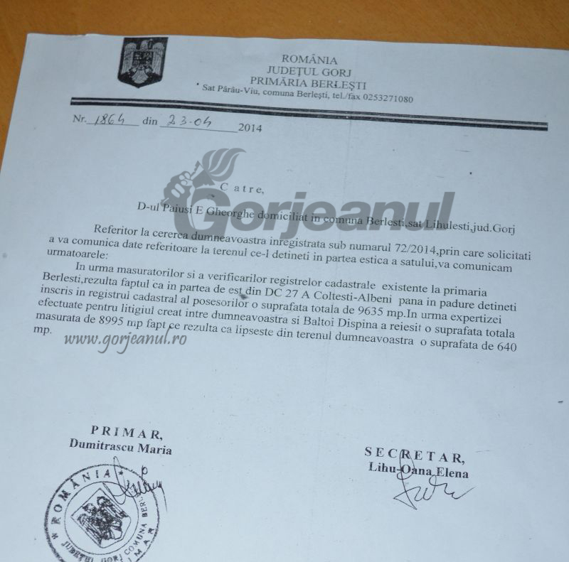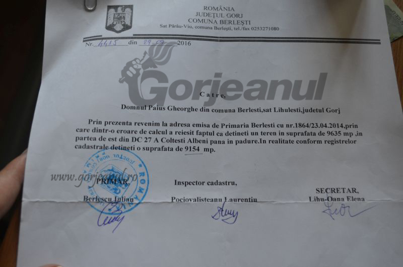 Șocant este că fosta conducere a Primăriei Berlești îl anunța pe proprietar că are în 2014, 9635 de mp, ca apoi în 2016, aceeași instituție să releve că proprietarul are 9154 de mp. Membrii Comisiei de Fond Funciar din Berlești beneficiază de spor de 50% din salariul de bază pentru că fac parte din acest organism. Adresa transmisă în 26 septembrie 2016 lui Gheorghe Păiuș arată însă că respectiva comisie își face treaba după poftele membrilor săi, omul fiind informat atunci că această comisie nu vrea să se deplaseze în teren.