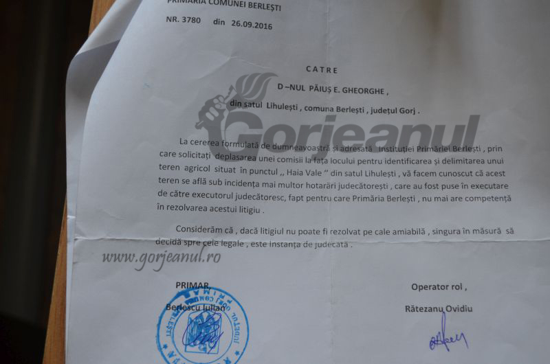 Gheorghe Păiuș a fost dat în judecată de o vecină pe motiv că i-ar fi ocupat abuziv acesteia o suprafață de teren de 177 de mp. Procesul s-a derulat din 2013 până în 2017, ani în care părțile au prezentat diferite documente și expertize instanțelor de judecată. Unul dintre documentele hotărâtoare în acest proces a fost eliberat chiar de Primăria Berlești, mai exat de Comisia Locală de Fond Funciar, care, deși solicitată de pârât să se deplaseze la fața locului, a eliberat actul din birou. Cetățeanul consideră că actul respectiv nu este conform cu realitatea din teren pe care comisia ar fi refuzat să o studieze la fața locului.