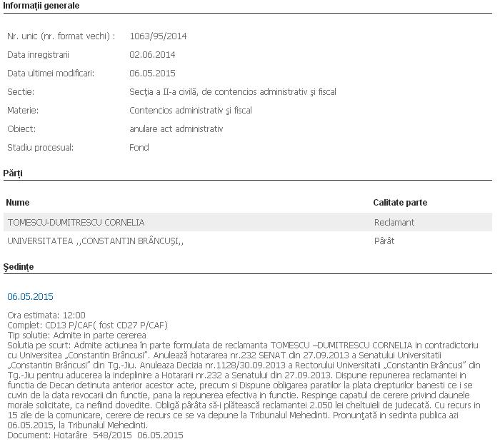 Instanţa din Mehedinţi îi dă parţial dreptate fostului decan, asta în timp ce pe rolul altor instanţe se află şi alte litigii ale angajatei cu angajatorul său. “Admite actiunea în parte formulata de reclamanta Tomescu –Dumitrescu Cornelia în contradictoriu cu Universitea «Constantin Brâncuşi». Anulează hotararea nr.232 de Senat din 27.09.2013 a Senatului Universitatii «Constantin Brâncuşi» din Tg.-Jiu. Anulează Decizia nr.1128/30.09.2013 a Rectorului Universităţii «Constantin Brâncuşi» din Tg.-Jiu pentru aducerea la îndeplinire a Hotărârii nr.232 a Senatului din 27.09.2013. Dispune repunerea reclamantei în funcţia de Decan deţinută anterior acestor acte, precum şi Dispune obligarea pârâţilor la plata drepturilor bănesti ce i se cuvin de la data revocarii din funcţie, până la repunerea efectivă în funcţie. Respinge capătul de cerere privind daunele morale solicitate, ca nefiind dovedite. Obligă pârâta să-i plătească reclamantei 2.050 lei cheltuieli de judecată”, se arată în sentinţa recentă de la Tribunalul Mehedinţi, ce poate fi atacată însă cu recurs la aceeaşi instanţă.