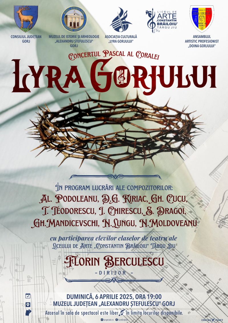 Duminică, 6 aprilie, în sala Muzeului Județean “Alexandru Ștefulescu” a avut loc concertul de muzică sacră al Coralei “Lyra Gorjului” (Camelia Eleonora Popescu, Ramona Nicoleta Lăcătușu, Alina Lăcătușu, Alina Diana Betej, Loredana Buliga, Ștefania Gîlcescu Haidău, Florin Dumitrescu, Ionuț Pătrulescu, Cosmin Brehuță Ciobănuc, Ștefan Socaci, Radu Geică, Ovidiu Vezure, Claudiu Sebastian Hosu). Dirijor, Florin Berculescu.