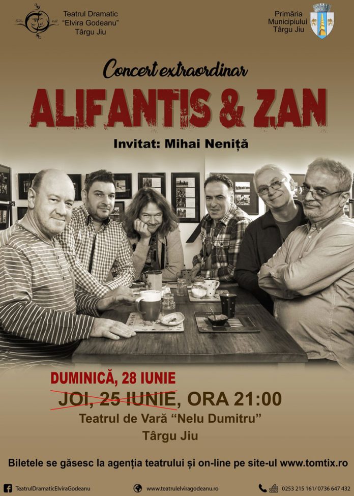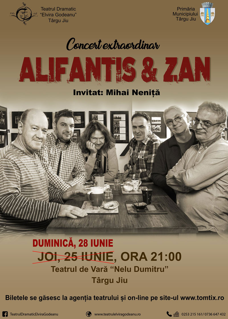 Concertul extraordinar Alifantis & Zan, ce urma să se desfășoare în această seară, s-a amânat pentru duminică, 28 iunie. Decizia a fost luată din cauza condițiilor meteo nefavorabile.