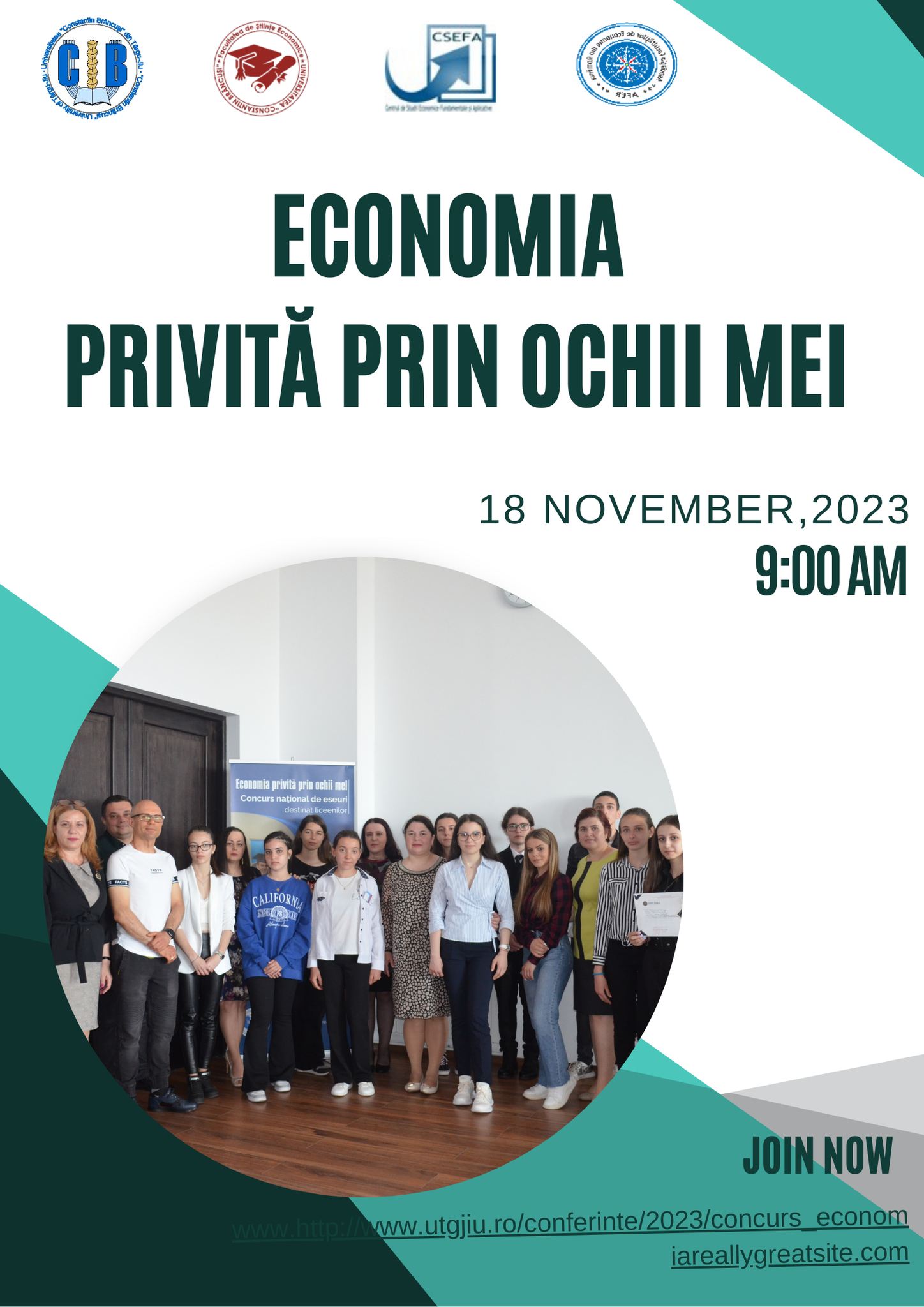 Facultatea de Științe Economice din cadrul Universității ”Constantin Brâncuși” Târgu Jiu organizează cea de-a VII-a ediție a concursului național de eseuri ”Economia privită prin ochii mei”. Această competiție se adresează elevilor de liceu, respectiv cei care sunt în clasele IX-XII.