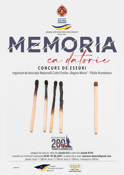 Elevii de liceu din județele Hunedoara și Gorj sunt invitați să participe la concursul de eseuri ”Memoria ca datorie”, organizat de Asociația Națională Cultul Eroilor ,,Regina Maria” – Filiala Hunedoara, cu ocazia Zilei Eroilor.