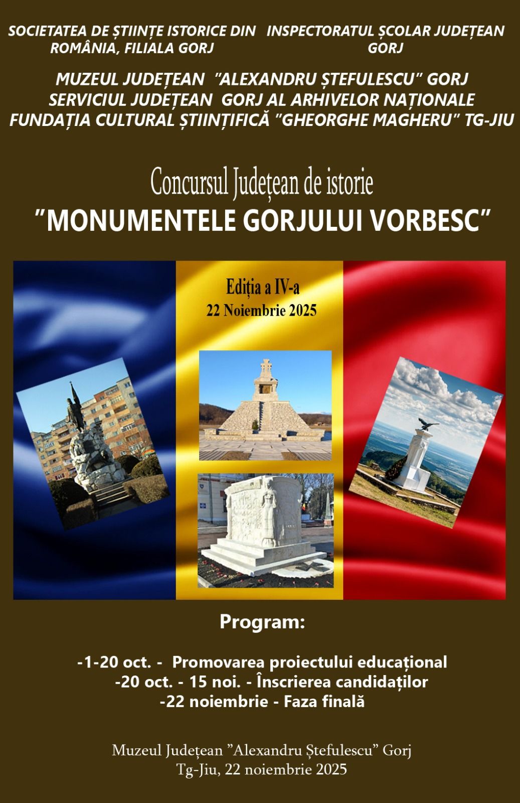 Societatea de Științe Istorice din România – Filiala Gorj, în parteneriat cu Inspectoratul Școlar Județean Gorj, Muzeul Județean „Alexandru Ștefulescu” Gorj, Serviciul Județean Gorj al Arhivelor Naționale și Fundația Cultural Științifică „Gheorghe Magheru” Târgu Jiu, organizează Concursul Județean de Istorie „Monumentele Gorjului vorbesc” – ediția a IV-a.
