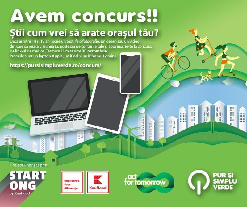 Asociația Pur și Simplu Verde derulează în lunile octombrie și noiembrie proiectul Teens for Green Cities, proiect finanțat prin Start ONG, lansat de Kaufland România și implementat de Asociaţia Act for Tomorrow. Proiectul Teens for Green Cities își propune implicarea adolescenților cu vârste cuprinse între 14 și 18 ani în dezbaterea publică și creșterea gradului de conștientizare în rândul acestora în legătură cu viitorul zonelor de locuit și cu schimbările care trebuie făcute. „Dacă ai între 14 și 18 ani, scrie un text, fă o fotografie, un desen sau un video din care să reiasă viziunea ta, postează pe conturile tale și apoi înscrie-te la concurs, pe www.pursisimpluverde.ro/concurs. De acolo afli și toate detaliile legate de postare. Termenul limită este 30 octombrie, iar premiile, care vor fi decise de un juriu de specialitate, sunt un Macbook, un ipad și un iphone 12 mini”, au anunțat organizatorii. Potrivit regulamentului concursului, se poate trimite un singură postare per persoană. Postarea poate include un text de până la 600 de caractere, o poză, desen și/sau un video de până la 3 minute lungime, iar mesajul acesteia ar trebui să se adreseze atât tinerilor, cât și întregii comunități în care locuiesc autorii. Tinerii câștigători vor fi anunțați prin e-mail până la finalul lunii noiembrie 2021.