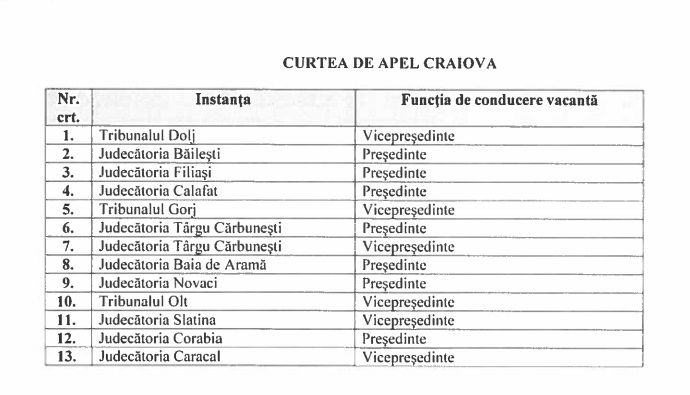 La Tribunalul Gorj este o singură funcție de conducere vacantă, cea de vicepreședinte. La Judecătoria Târgu-Cărbunești sunt vacante funcțiile de președinte și vicepreședinte, iar la judecătoria Novaci cea de președinte.