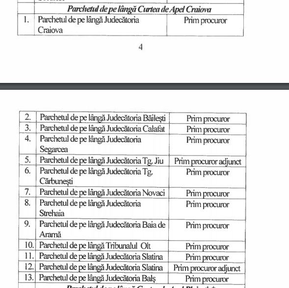 La Parchetul de pe lângă Judecătoria Târgu-Jiu este vacantă funcția de prim-procuror adjunct, la Parchetul de pe lângă Judecătoria Târgu-Cărbunești cea de prim-procuror, la fel ca la Novaci.