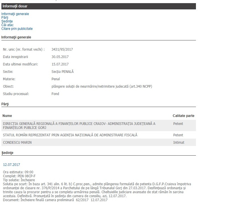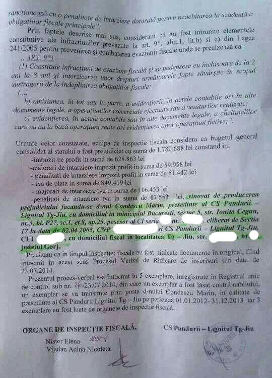 Ancheta în acest caz a demarat, în iulie 2014, după ce Complexul Energetic Oltenia a sesizat Parchetul cu privire la comiterea mai multor nereguli şi abuzuri de către Marin Condescu în perioada 2011-2013, iar pentru susţinerea celor reclamate a fost ataşat un raport de audit extern întocmit la clubul sportiv. Procurorii au stabilit că reevaluarea Hotelului Mina, înregistrarea eronată a investiţiilor la Stadionul “Tudor Vladimirescu” şi unele diferenţe valorice între balanţe şi bilanţuri sunt abateri de natură fiscală, deci nu există indicii privind comiterea infracţiunii de evaziune fiscală. Din acest dosar au fost disjunse alte două cauze în care s-au efectuat cercetări cu privire la comiterea infracțiunii de abuz în serviciu de către Condescu. În trei ani de zile de la demararea anchetei, Condescu nu a fost trimis în judecată pentru evaziune fiscală, în timp ce recuperarea prejudiciului a expirat. Pe 12 iulie 2017, o instanță a Tribunalul Gorj admite iar plângerea formulată de petenta D.G.F.P.Craiova împotriva ordonanţei de clasare nr. 376/P/2014 a Parchetului de pe lângă Tribunalul Gorj dată acum pe 27.03.2017. “Desfiinţează ordonanţa şi trimite cauza la procuror pentru a se completa urmărirea penală”, mai stabilesc judecătorii punându-i a doua oară la treabă pe procurorii într-un dosar în care aceștia susțin că faptele nu există. În prezent, Condescu are iar statut de urmărit penal în acest dosar de evaziune fiscală, acum însă acesta fiind din nou lider la CS Pandurii, club cu ambele picioare în faliment.