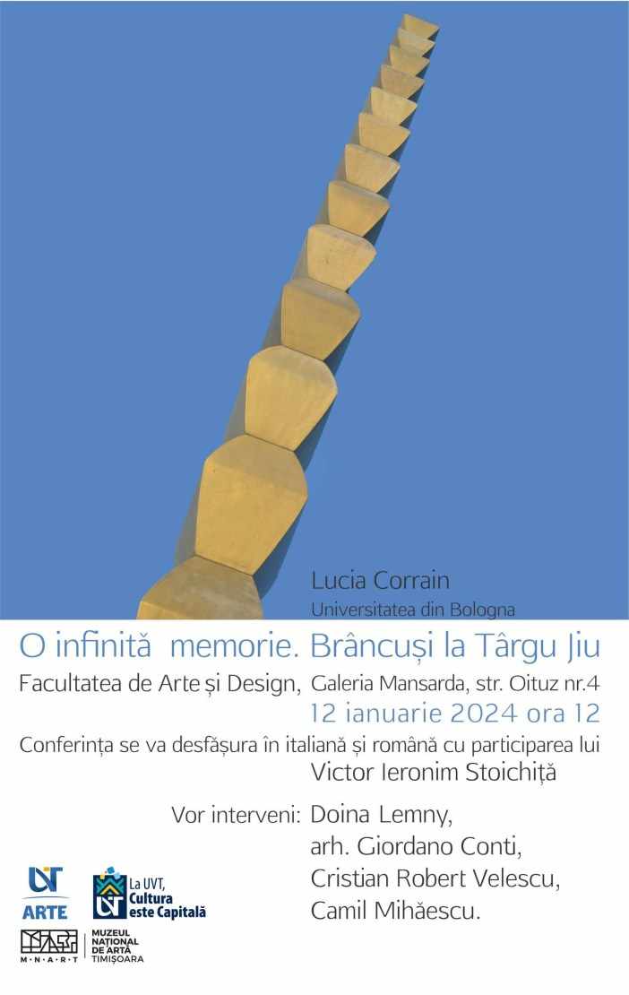 Conferința va avea loc de la ora 12:00, în Galeria Mansarda a Facultății de Arte și Design – UVT. Evenimentul se promite a fi unul unic, prin personalitățile de care vor lua cuvântul și vor aduce în fața publicului viața și operele sculptorului gorjean Constantin Brâncuși: Lucia Corrain, Victor Ieronim Stoichiță, Doina Lemny, Giordano Conti și Cristian-Robert Velescu.